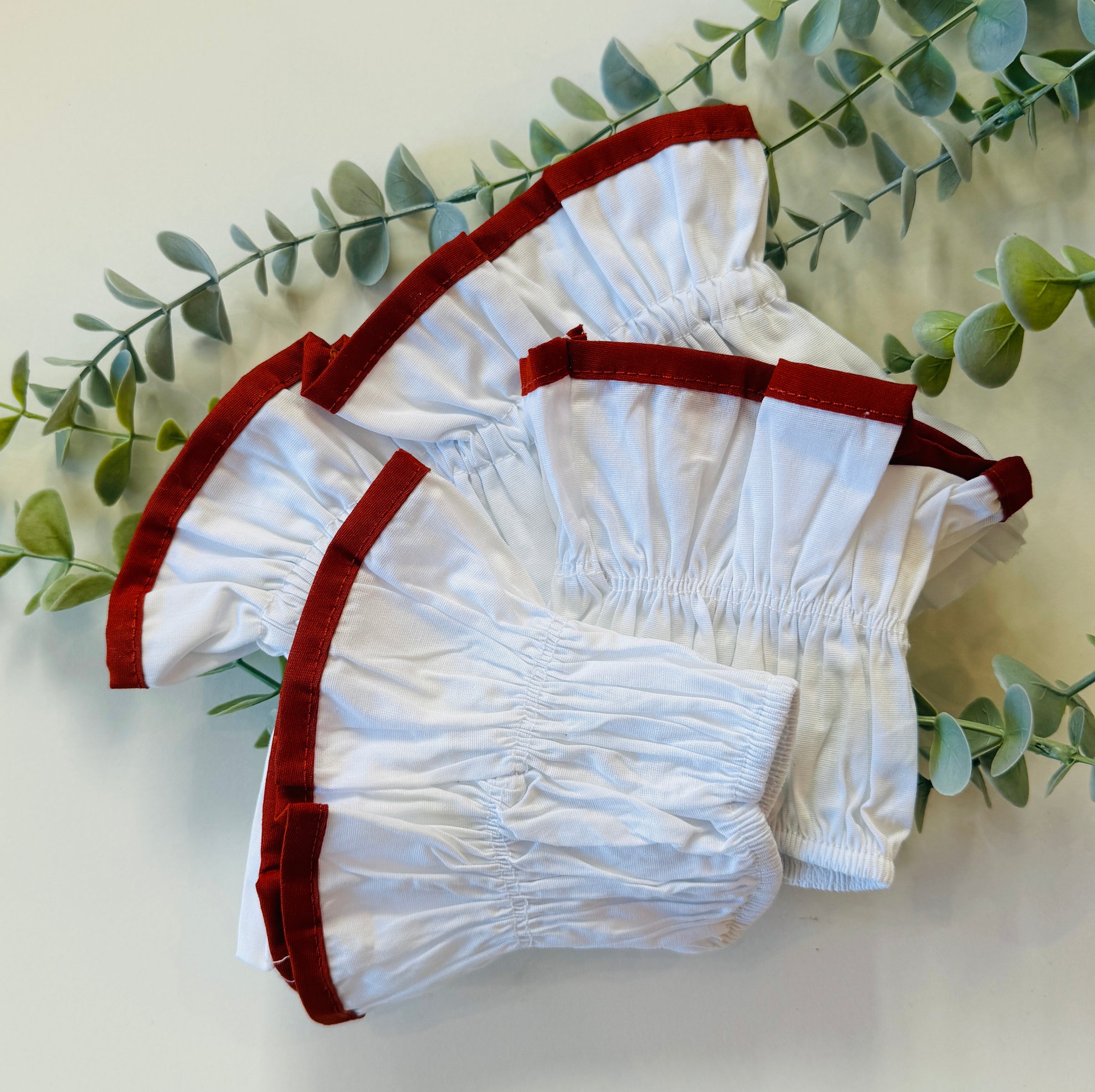 Kit composto da collo e polsini con dettaglio volant e elastico. Base bianca con profili colorati. Disponibile bordeaux, rosa antico, blu jeans, verde salvia, militare, rosso mattone e marrone.