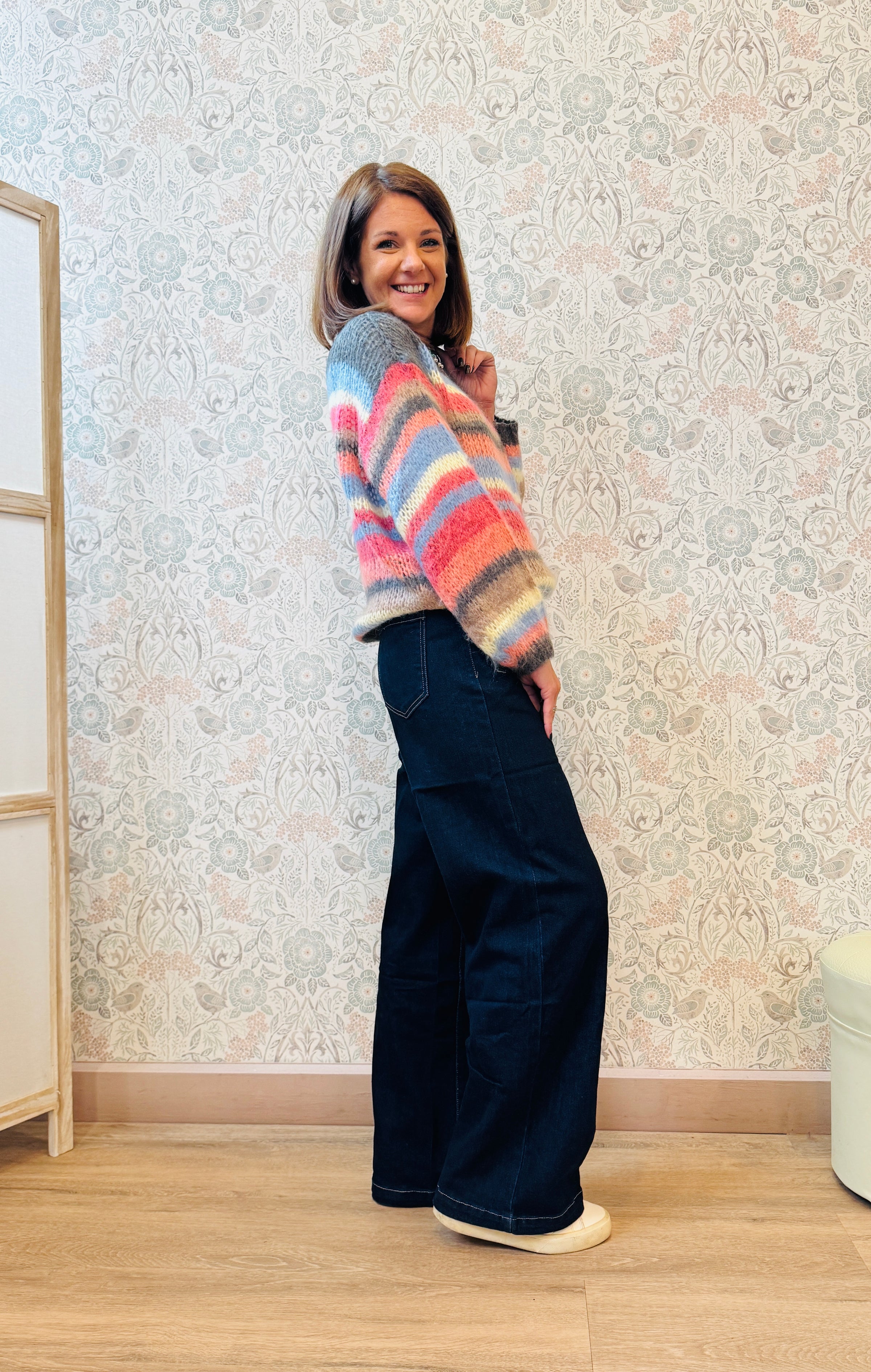 Maglione a trama grossa con scollo tondo e fantasia a righe colorate.