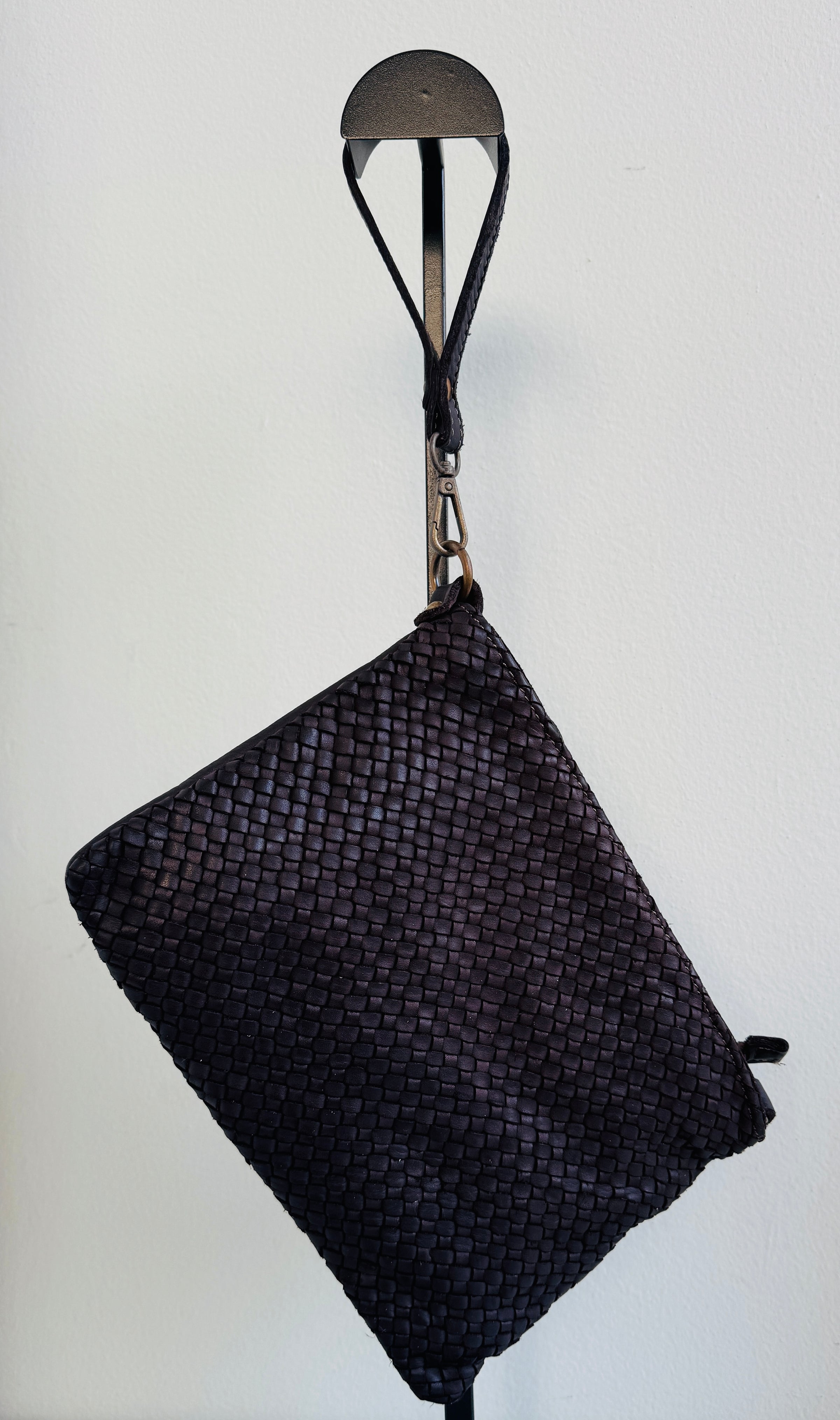 Borsa in pelle intrecciata con tracolla regolabile e removibile, tasca interna con zip e tasca esterna sul retro con zip.