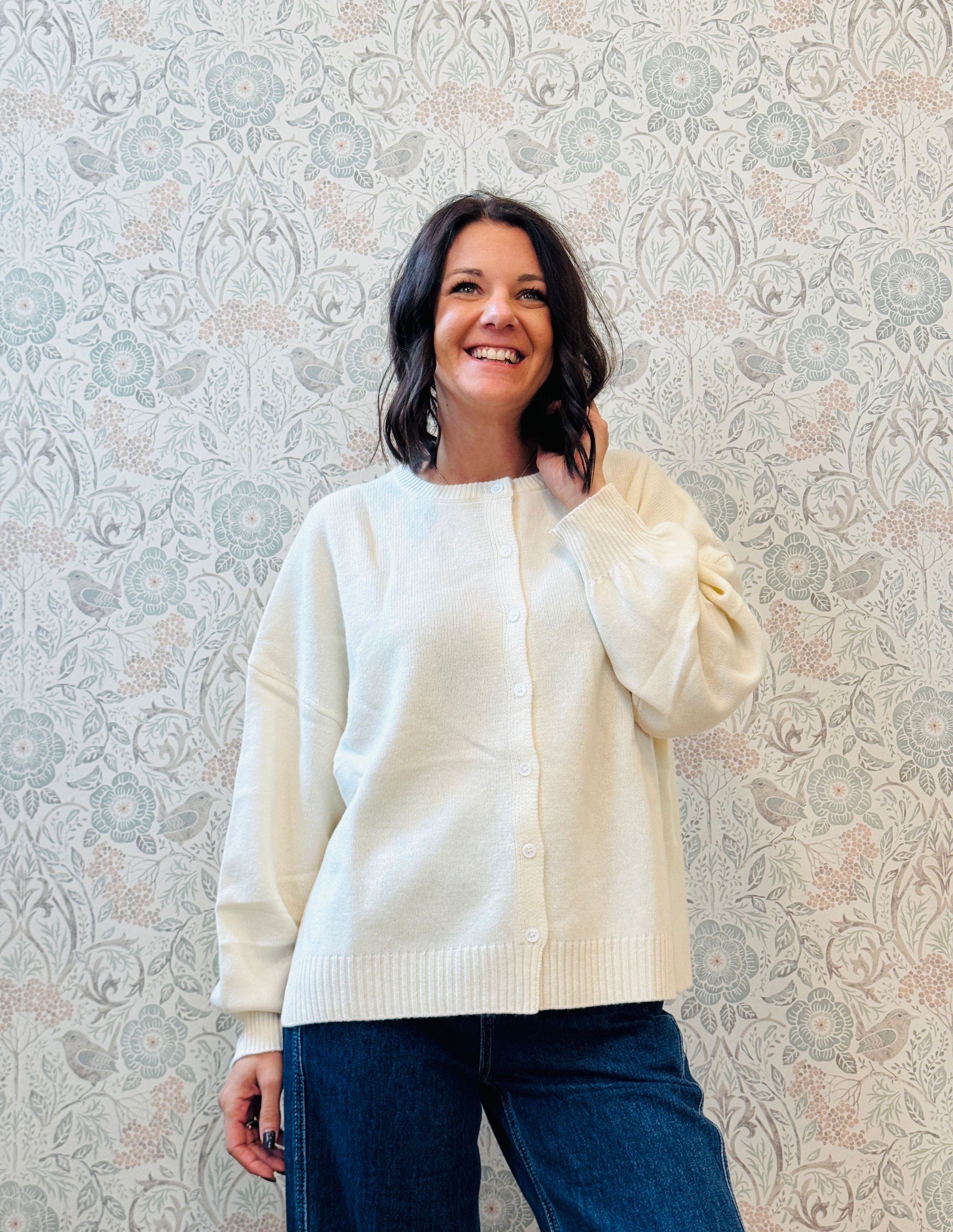 Cardigan color panna o beige con scollo tondo, bottoncini ad asola color tortora, spacchetti laterali e maniche leggermente a palloncino.