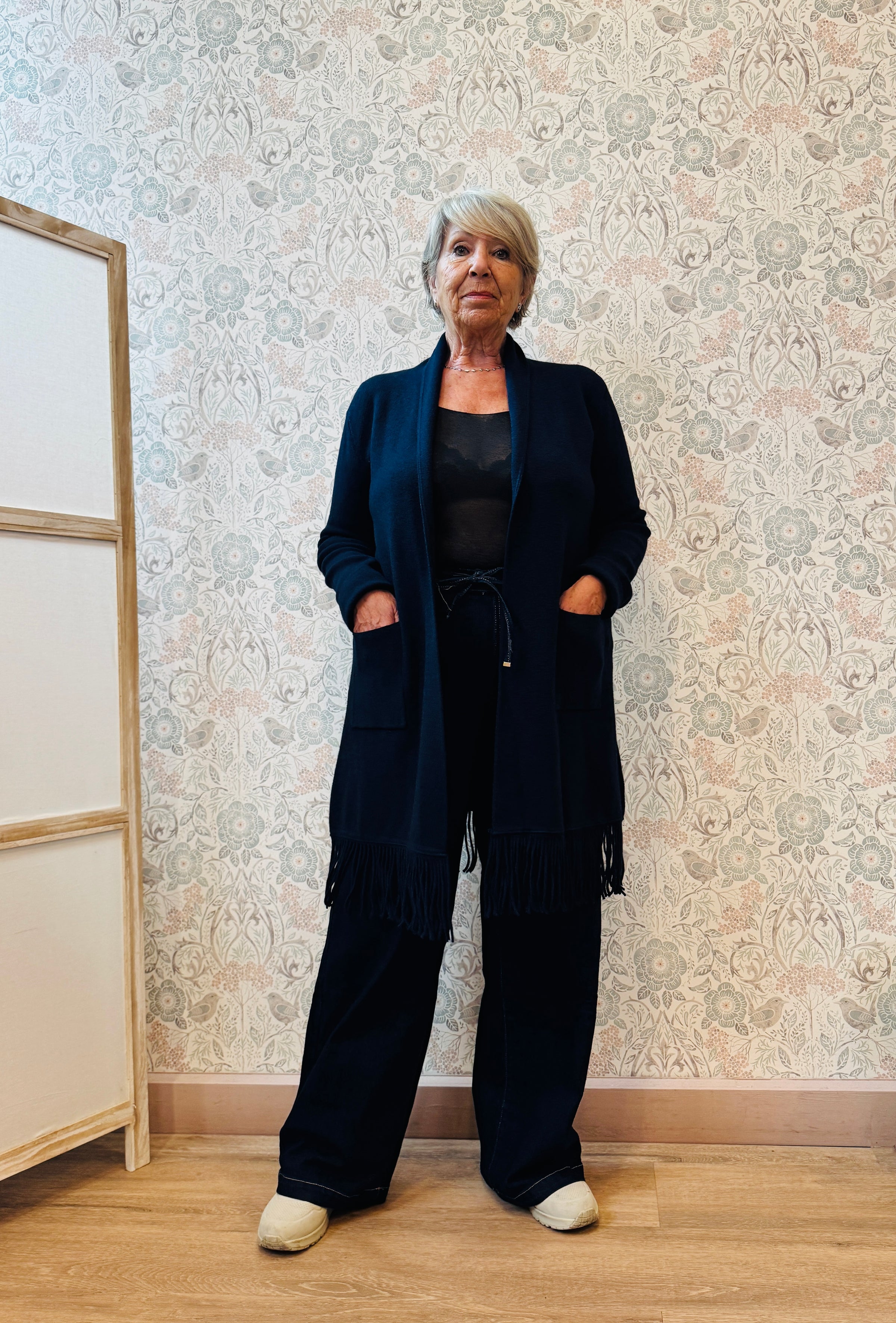 Cardigan lungo aperto con frange sul bordo finale. Vestibilita' molto morbida e ampia.
