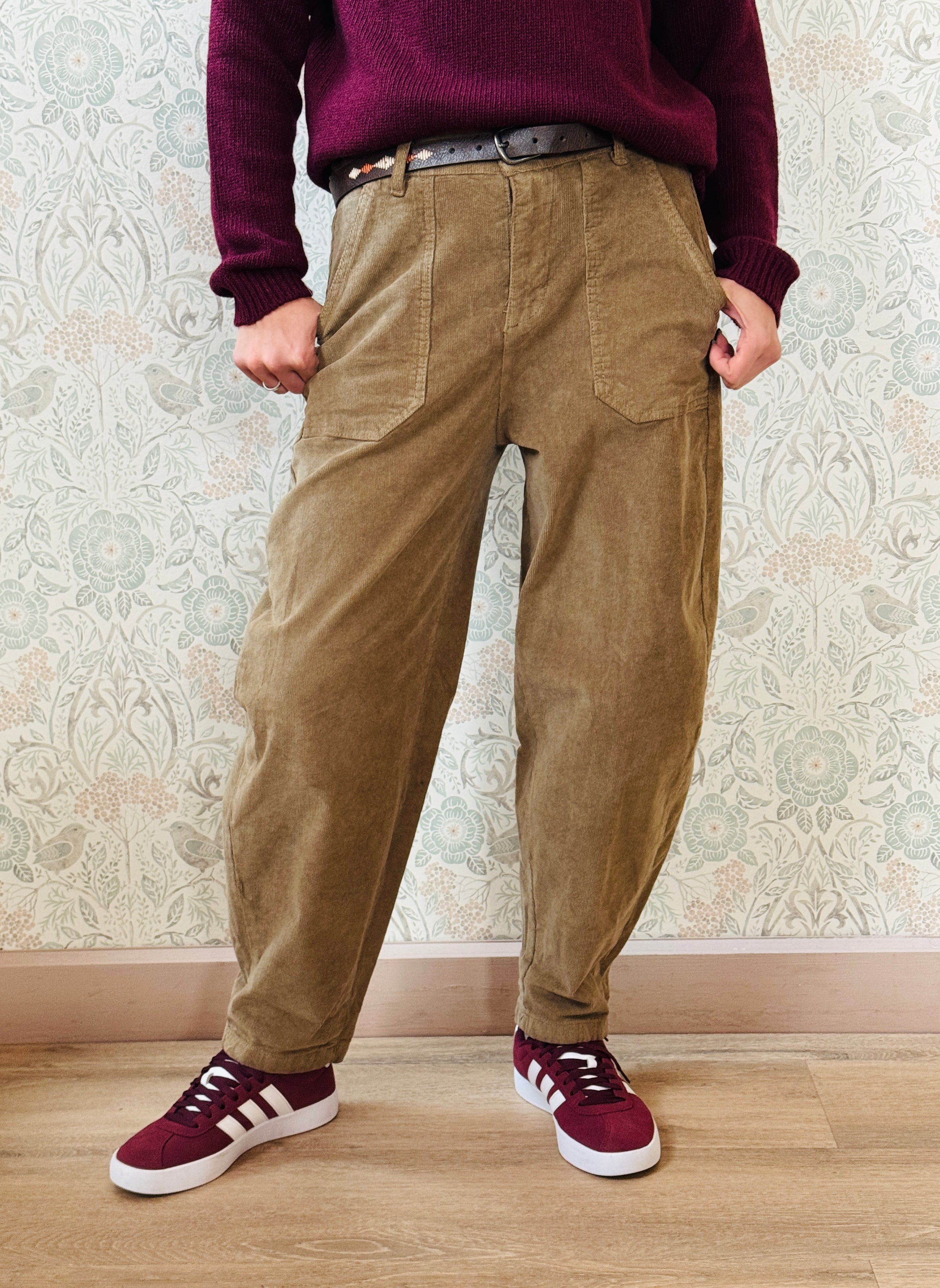 Pantalone con taglio a baloon con trama in velluto, con anche elastico in vita.
