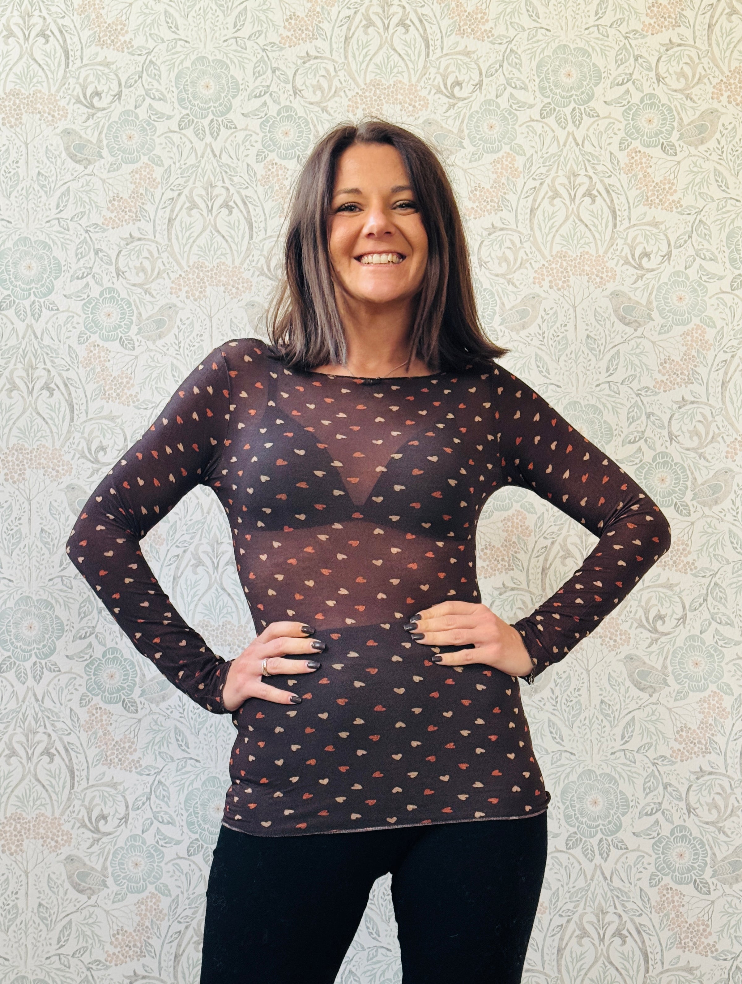T-shirt bodycon con scollo a barchetta e fantasia a cuoricini.