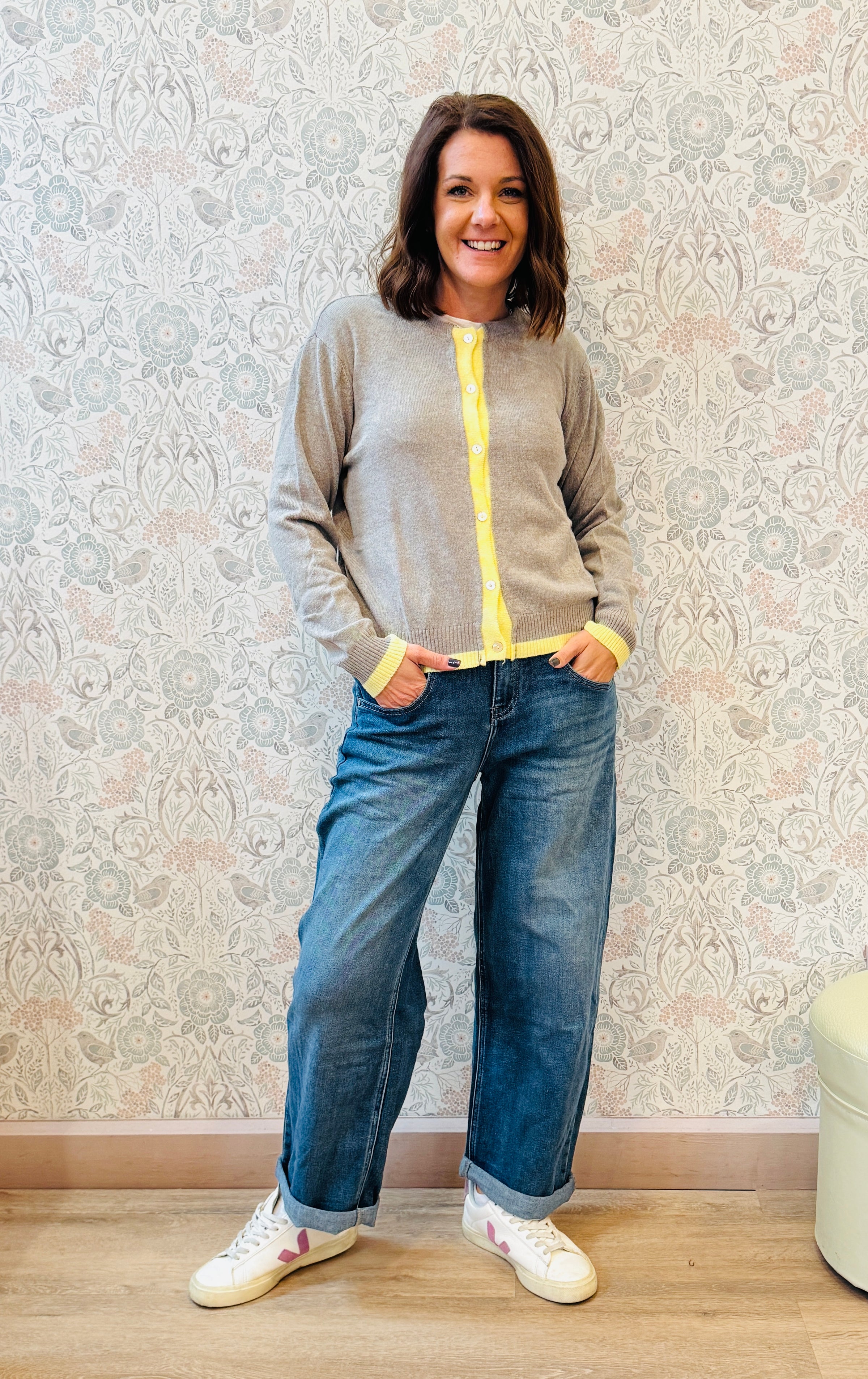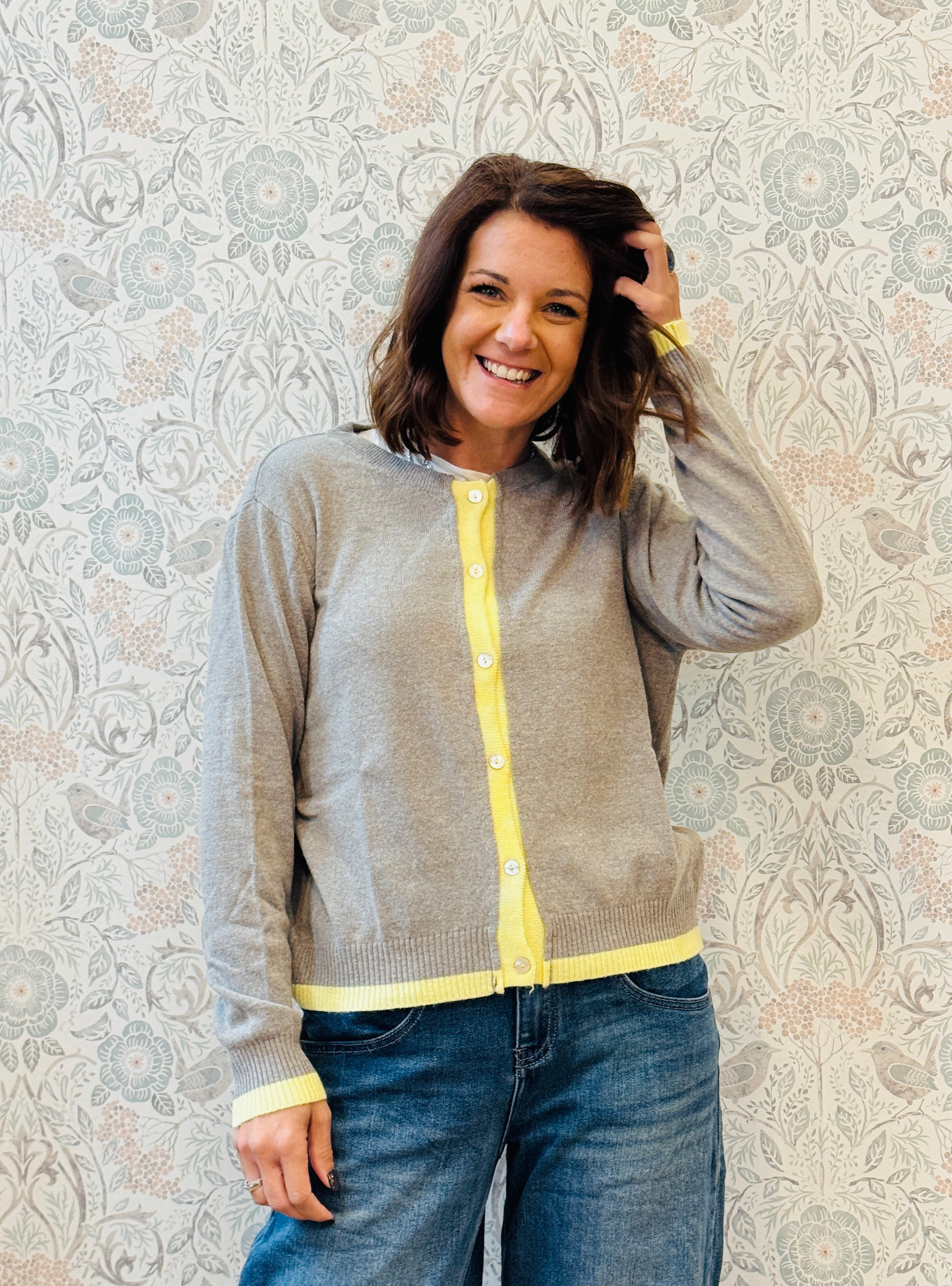 Cardigan con scollo tondo, linea colore sulla chiusura e sul bordo finale e bottoncini in madre perla. Taglio dritto e vestibilità morbida.