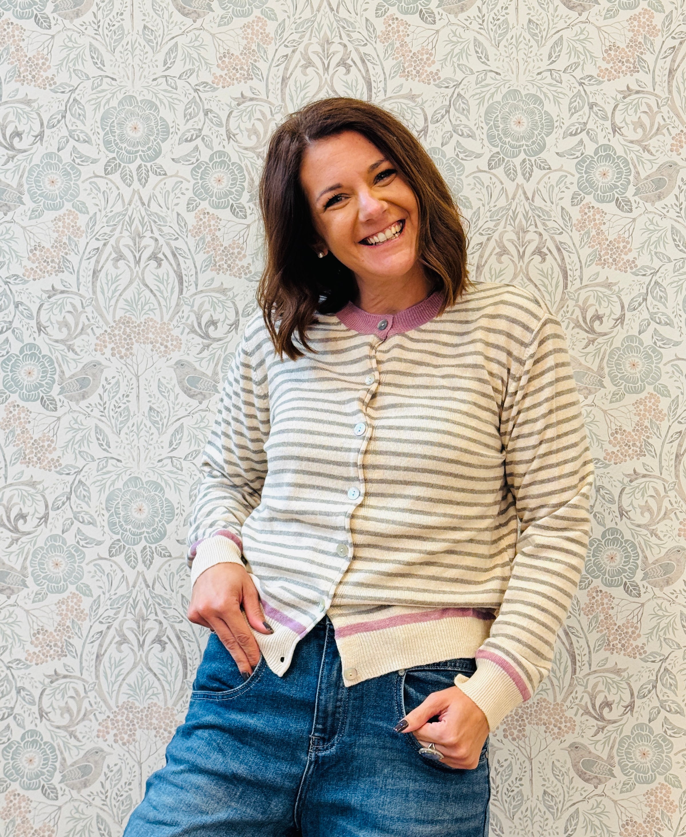 Cardigan con scollo tondo a righe con dettaglio linea colorata sul collo, sul bordo finale e sul bordo finale delle maniche. Taglio dritto e vestibilità morbida.