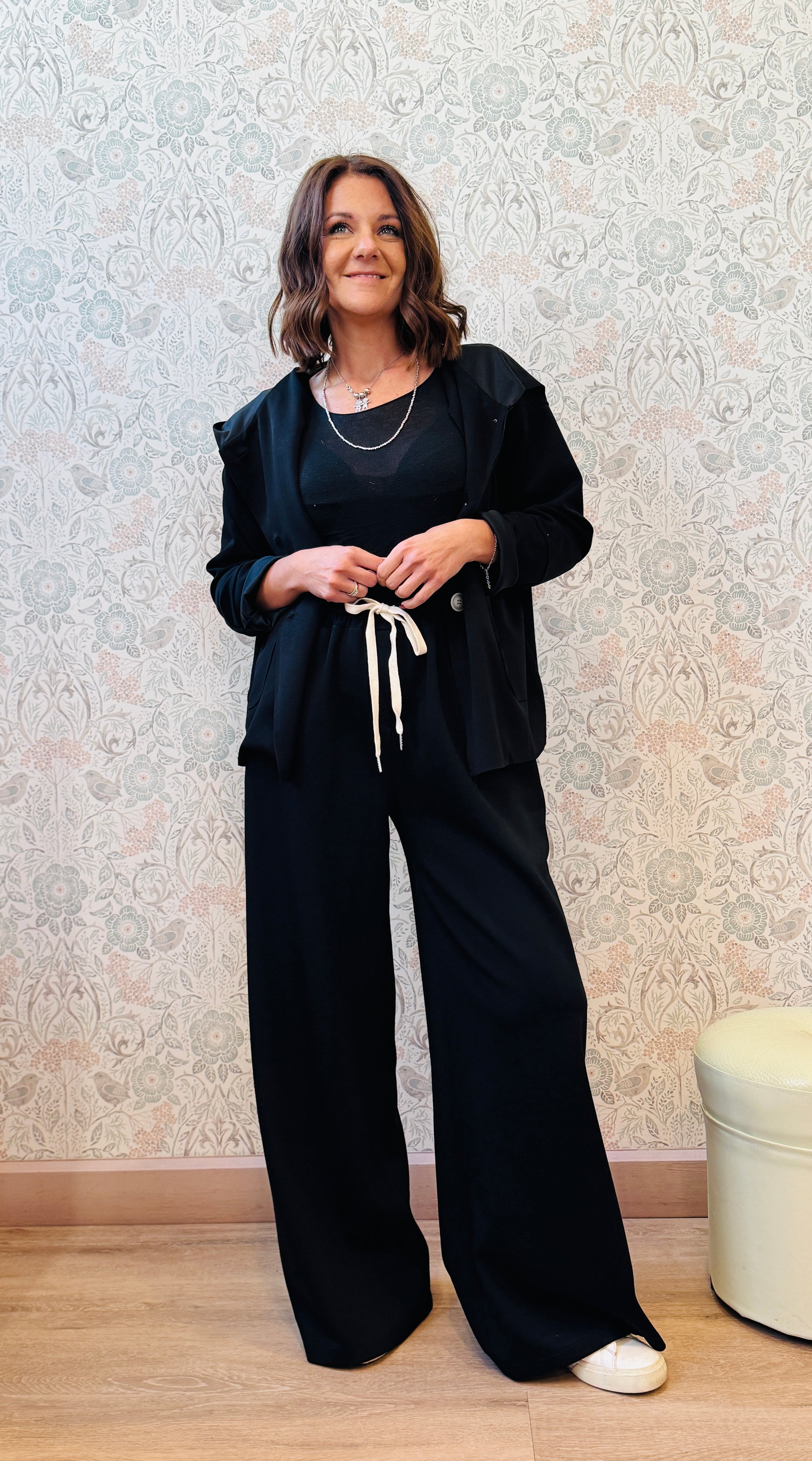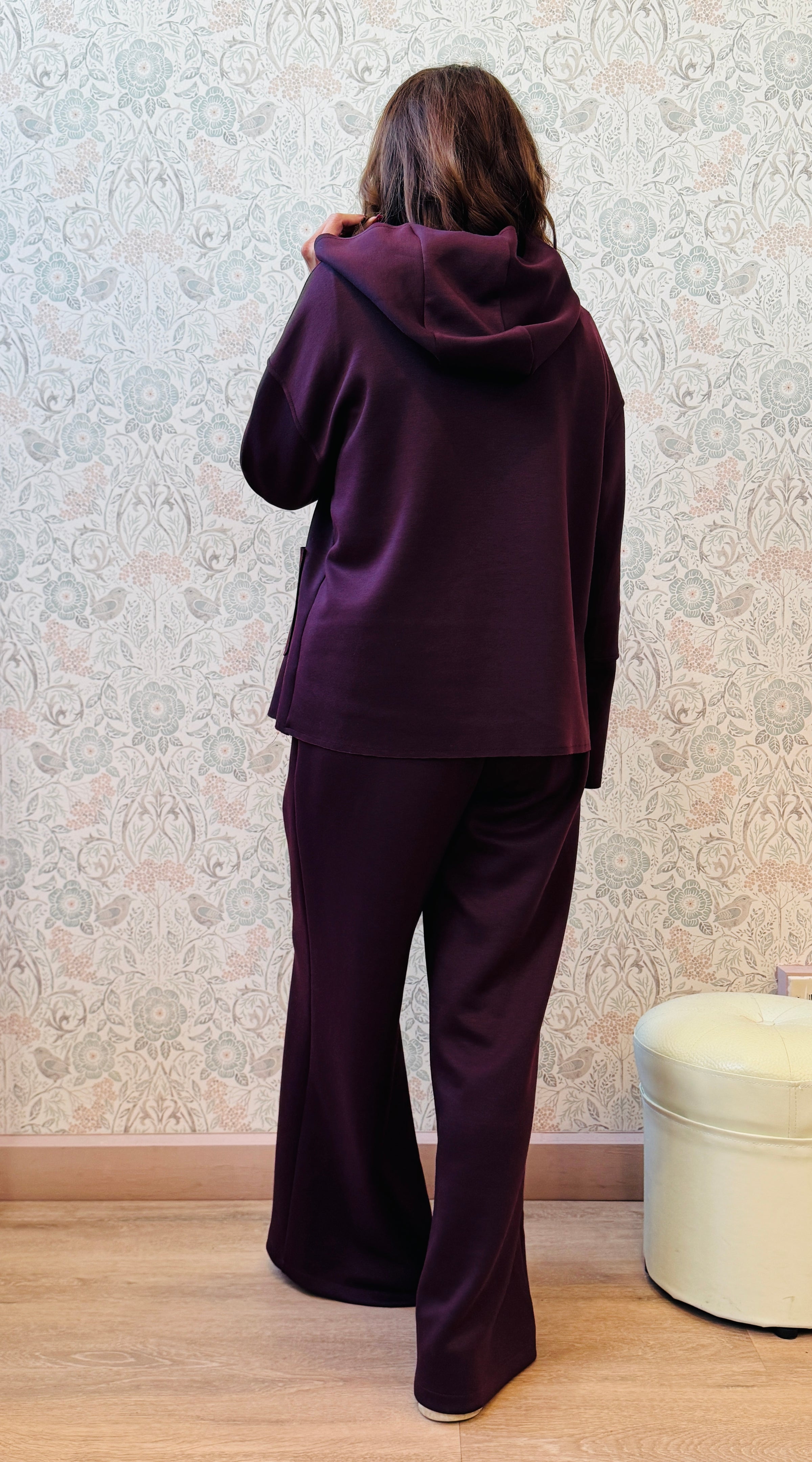 Completo composto da pantalone con elastico in vita, coulissè regolabile e taglio palazzo ampio e giacca con cappuccio, chiusura con bottoni ad asola e tasche laterali aperte e visibili.