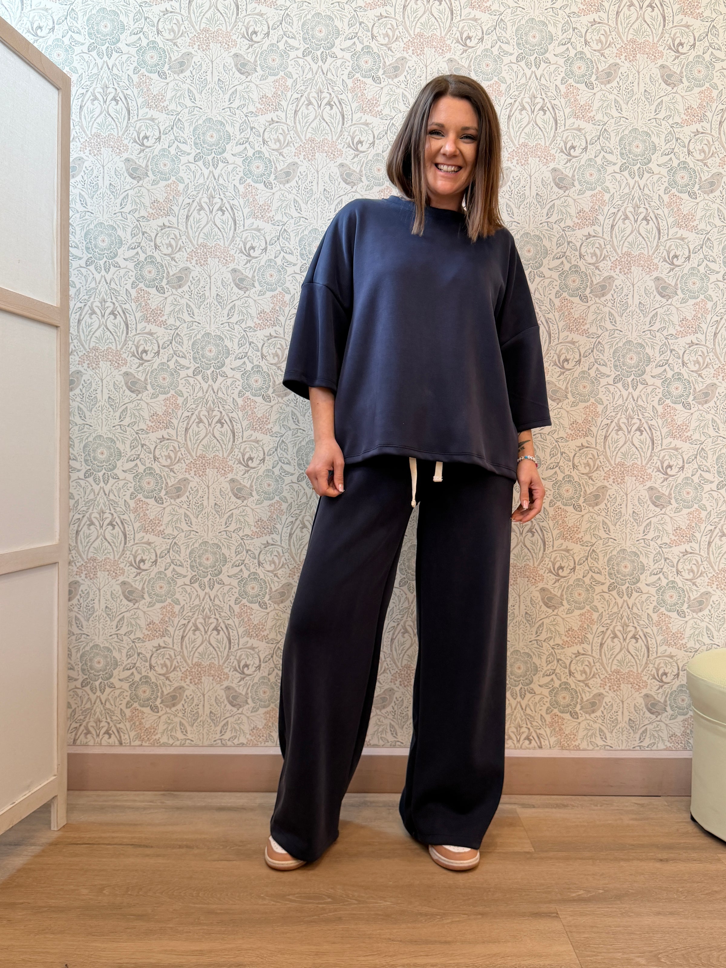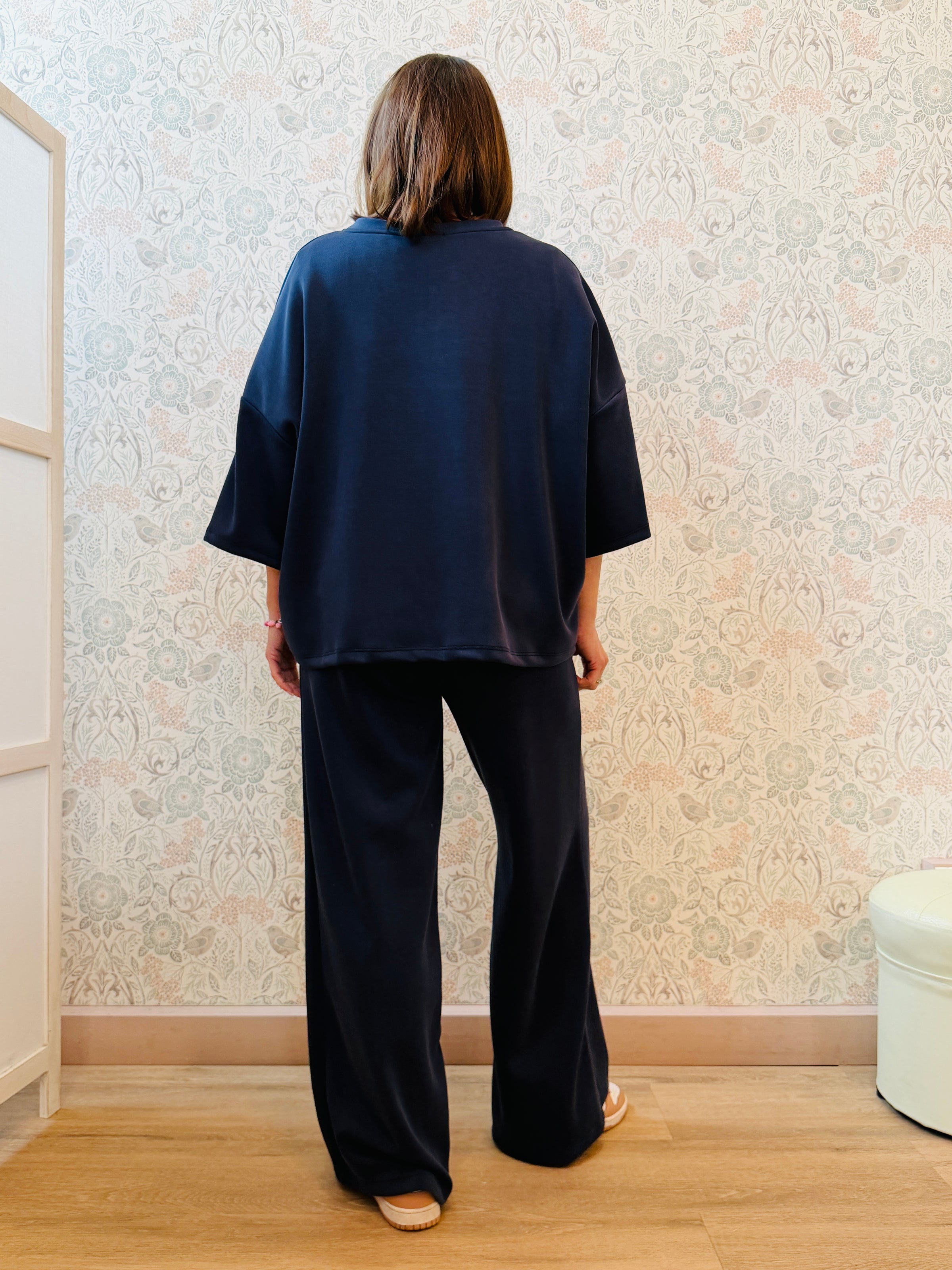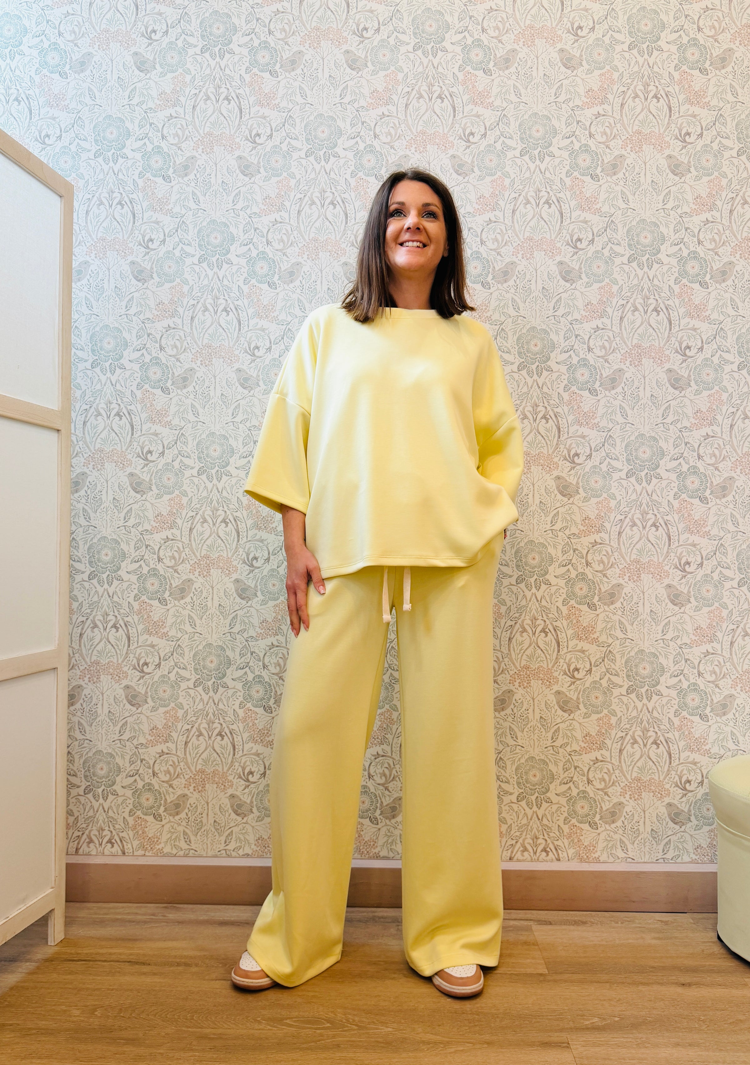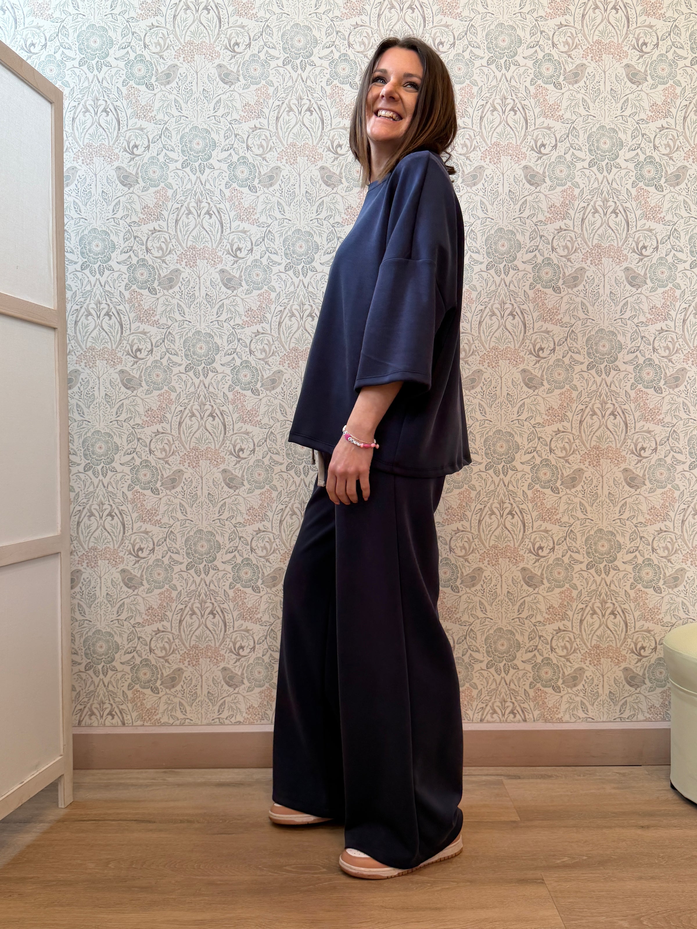 Completo composto da felpa con scollo tondo, a manica corta e taglio ampio e svasato, e pantalone taglio palazzo, con elastico in vita e coulissè e tasche laterali.