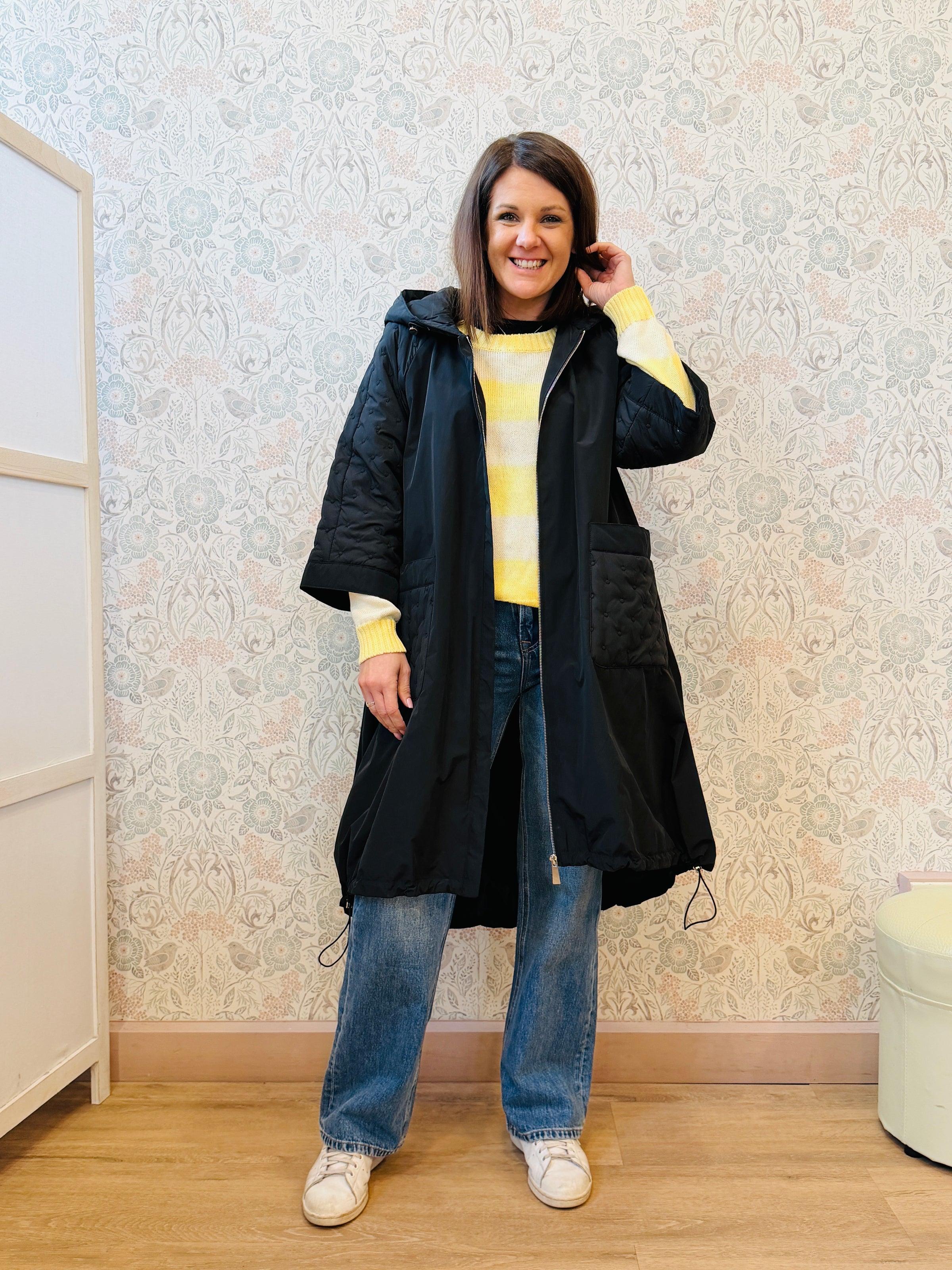 Giacca spolverino lungo con cappuccio, maniche svasate e tasche laterali aperte e visibili. Vestibilita' ampia e comoda.