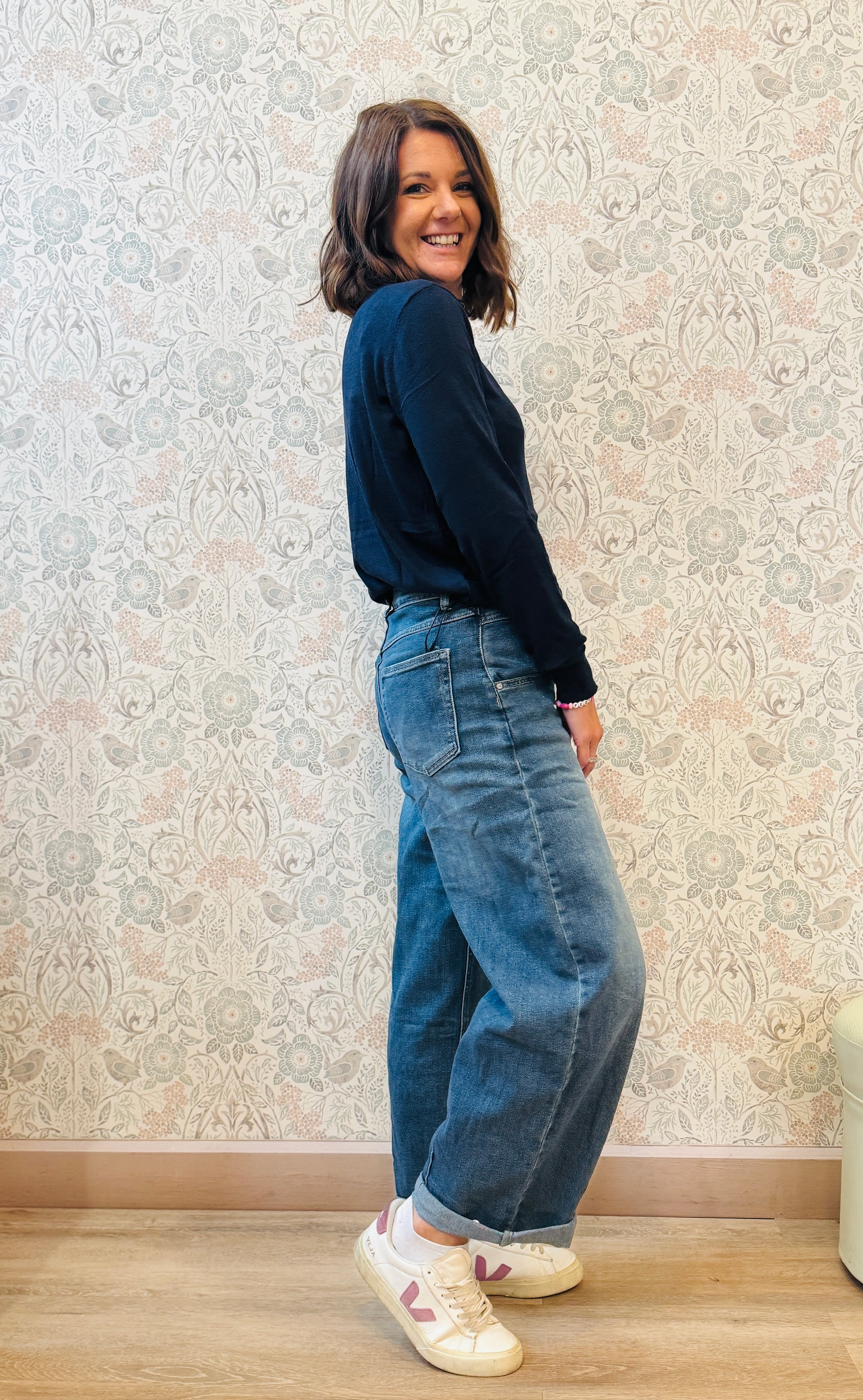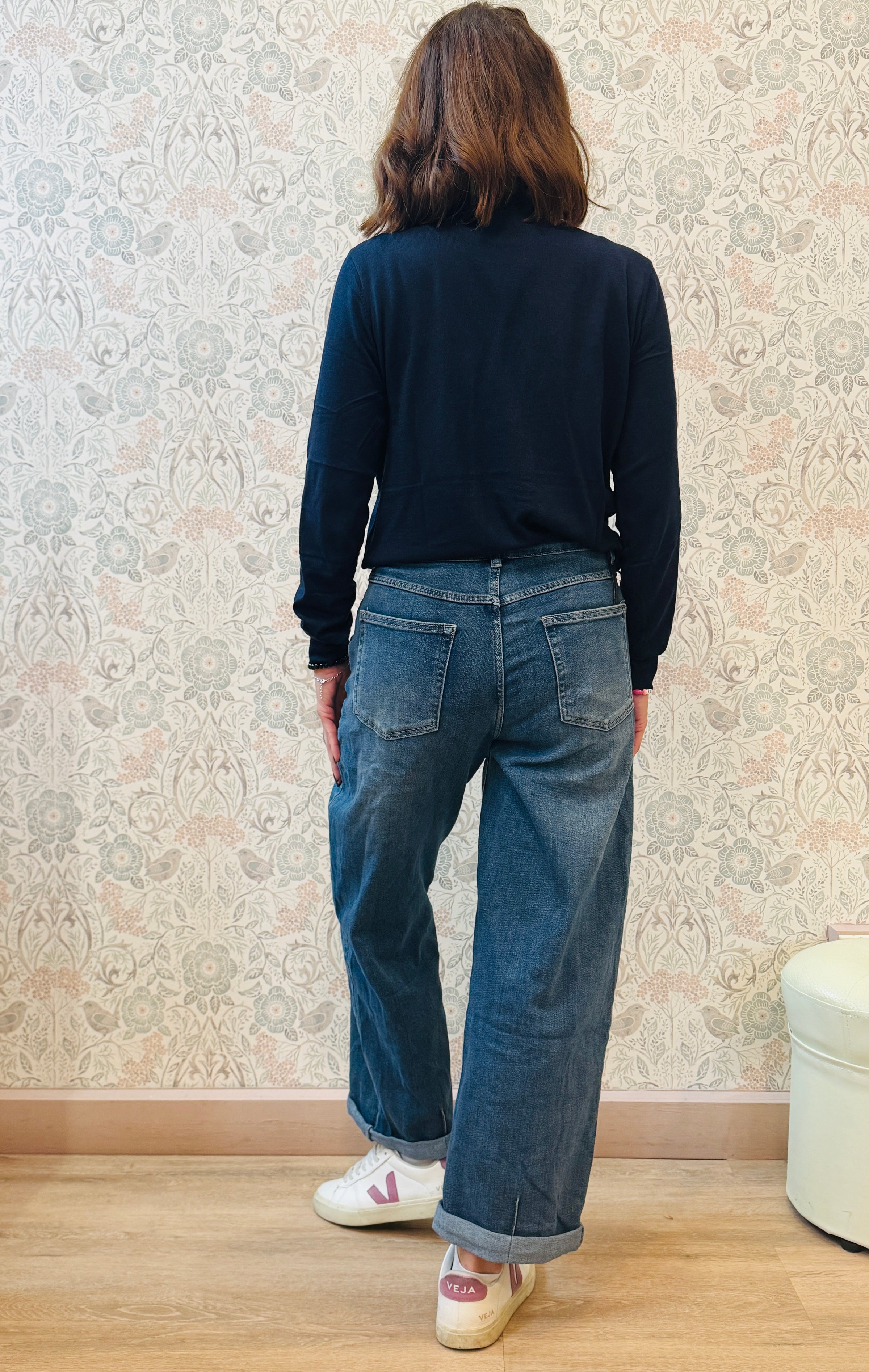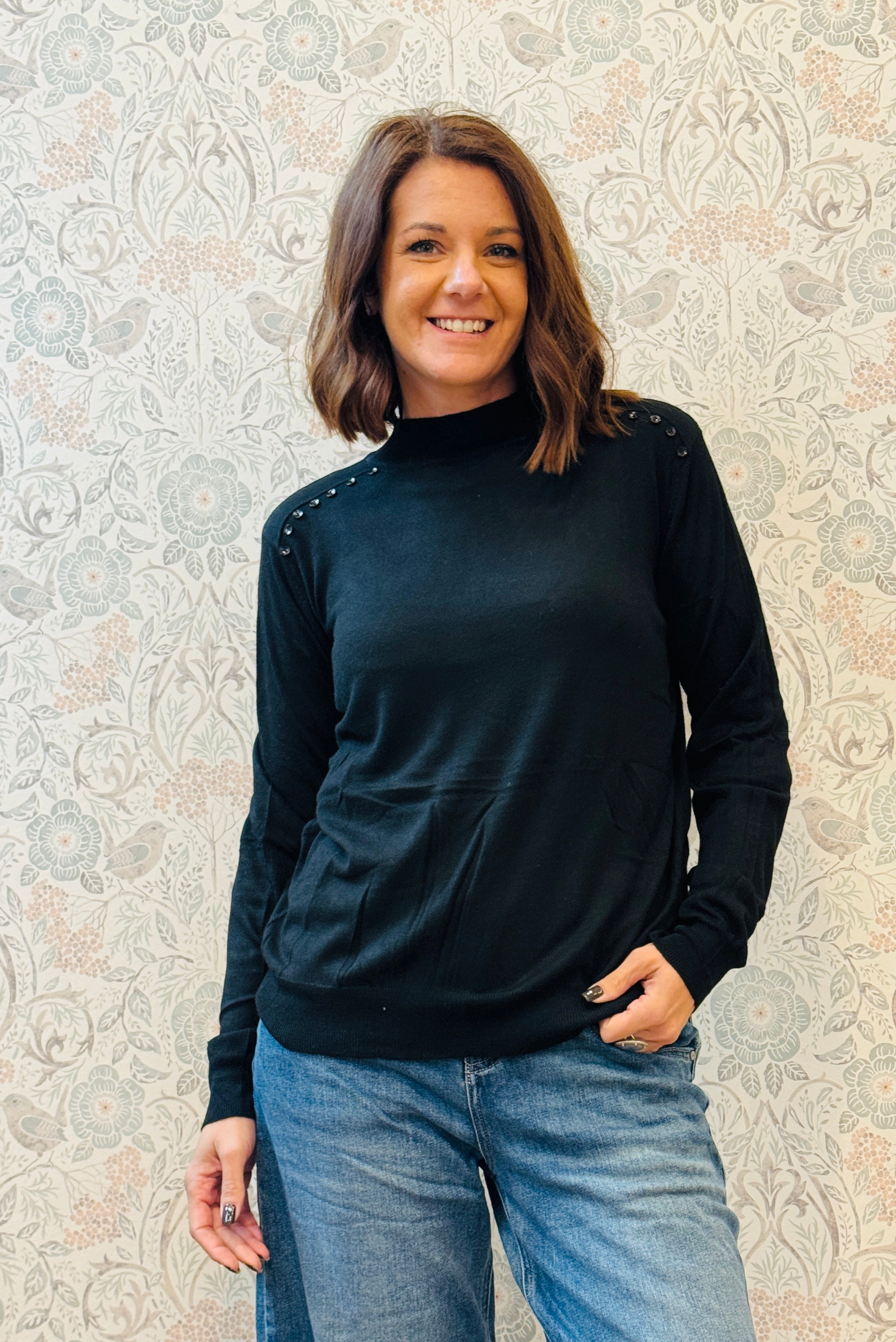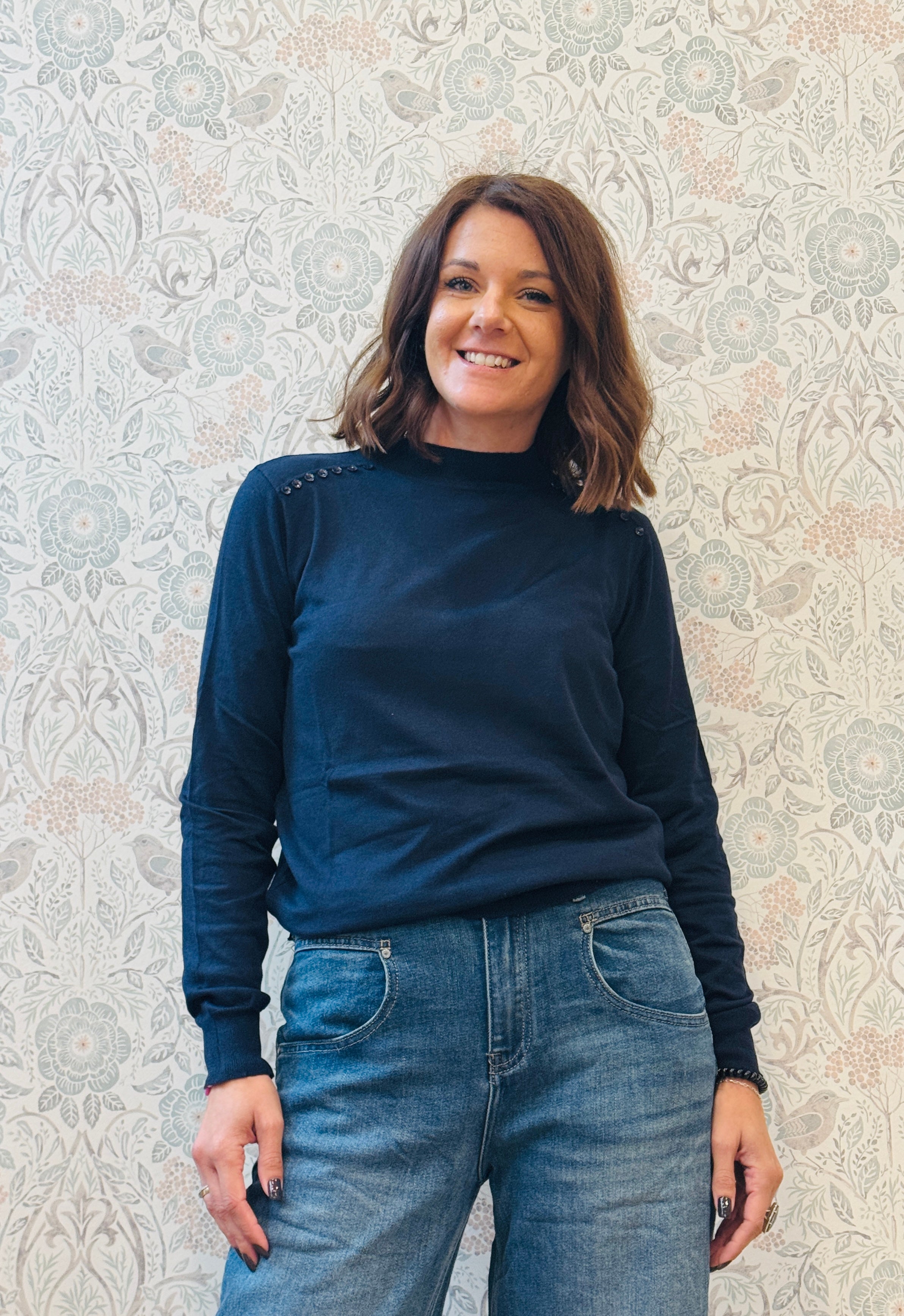 Maglione con scollo all'americana e bottoncini decorativi tono su tono sulle spalle.