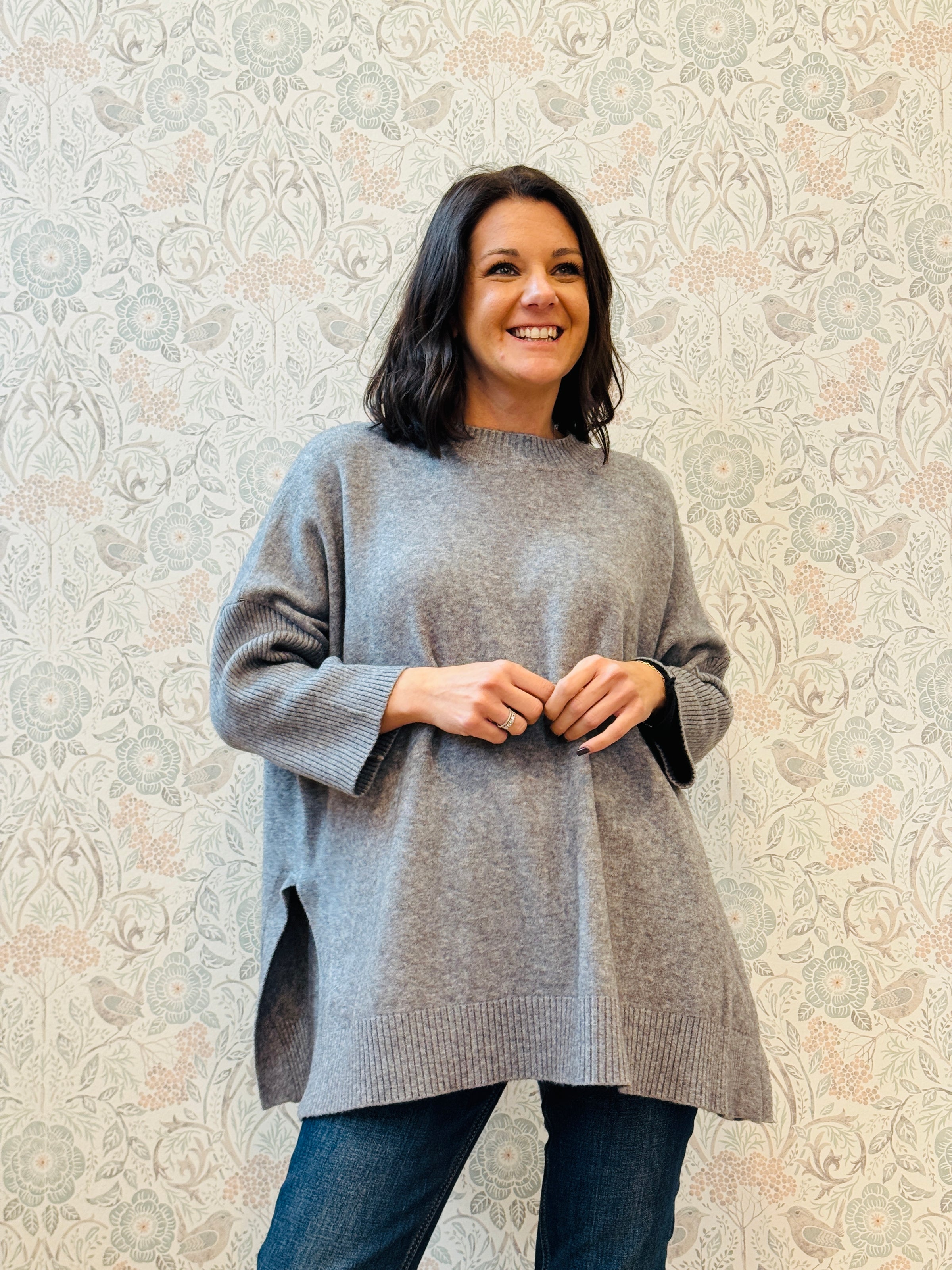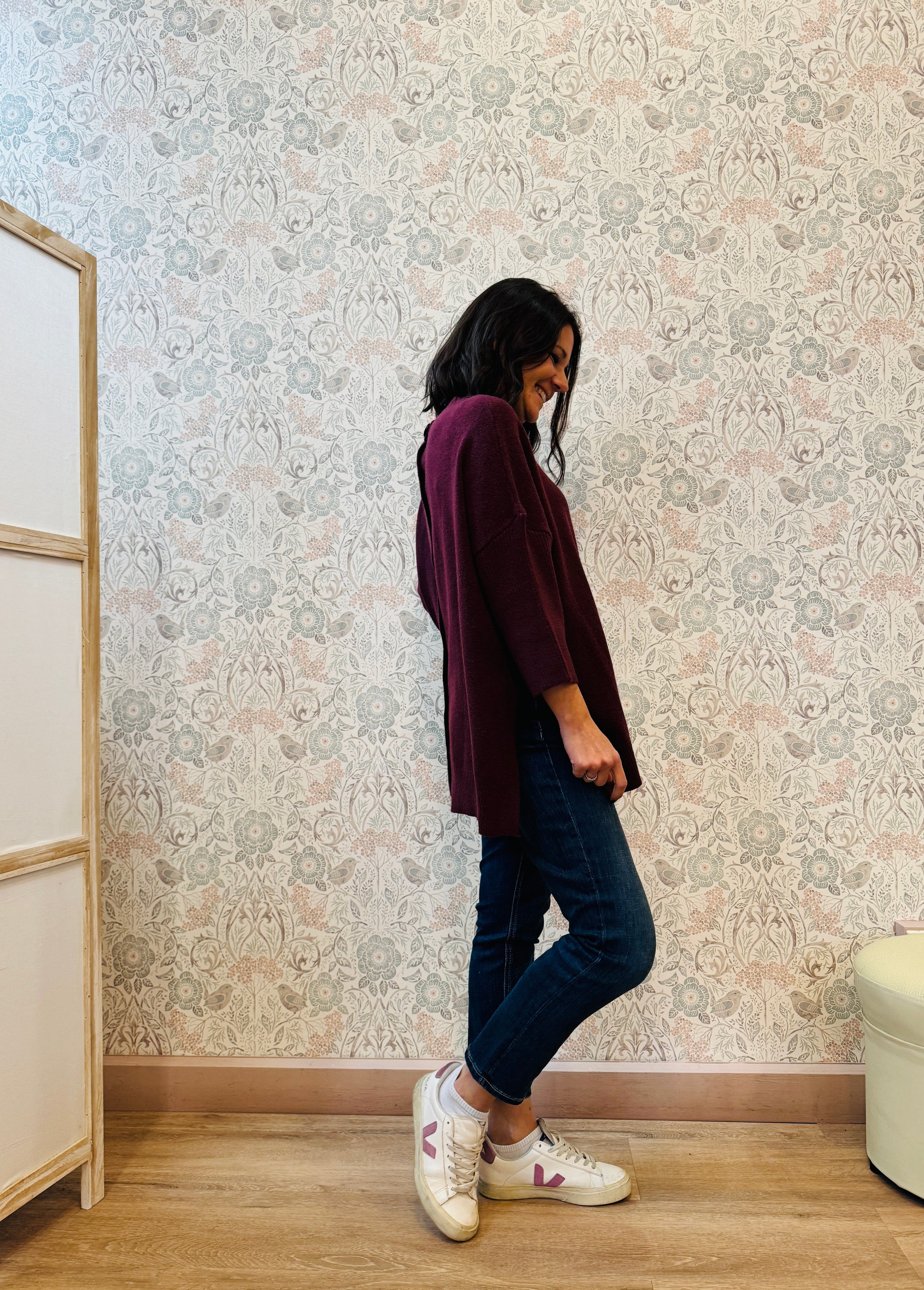 Maglione con scollo all'americana e apertura con bottoni ad asola sul retro. Taglio molto svasato e vestibilita' morbida.