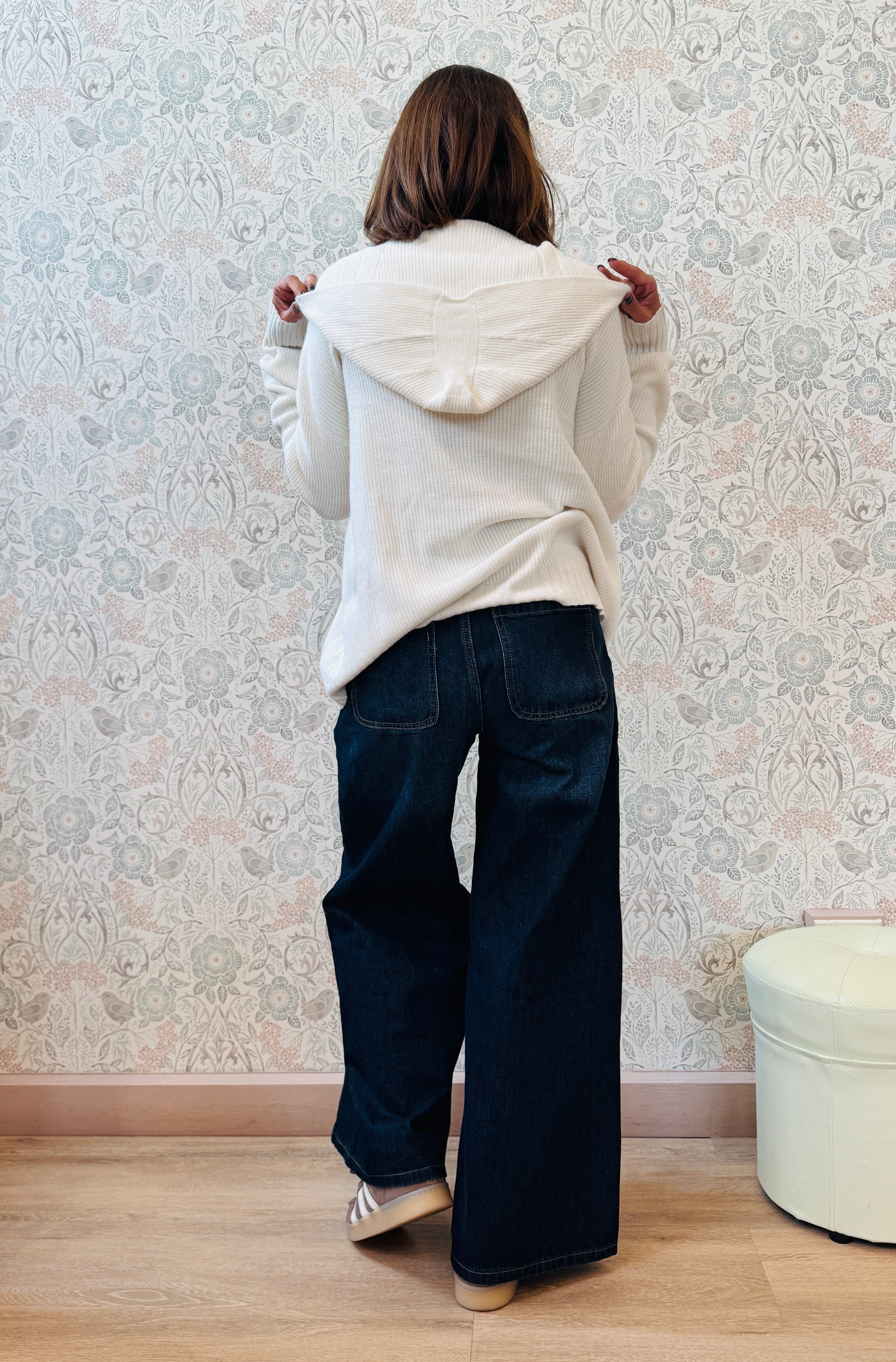 Maglione a costine con scollo a V e cappuccio. Taglio ampio e svasato e vestibilità morbida.