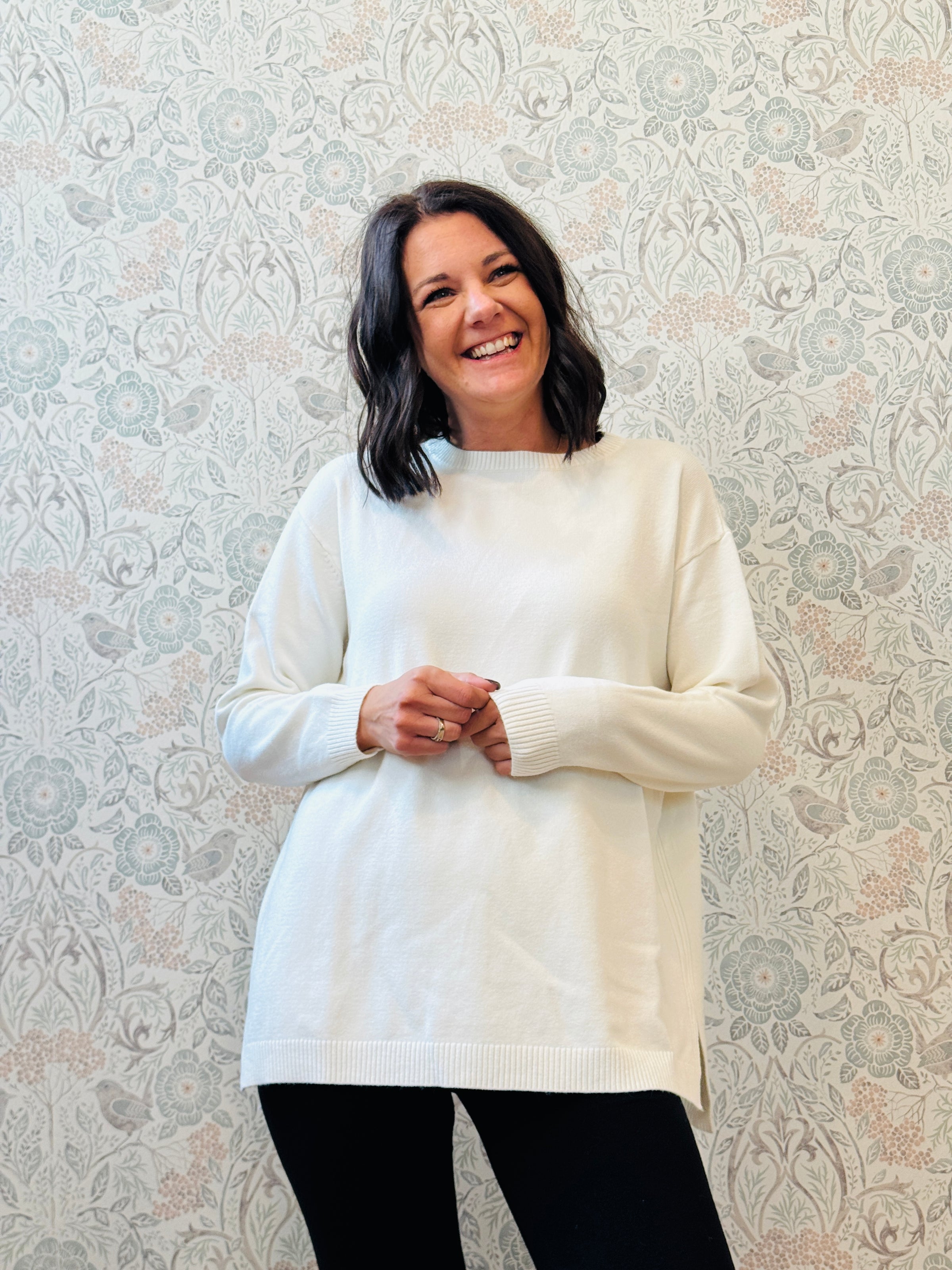 Maglione scollo tondo con bordo laterali a righe in rilievo con spacchetti laterali. Vestibilita' morbida.