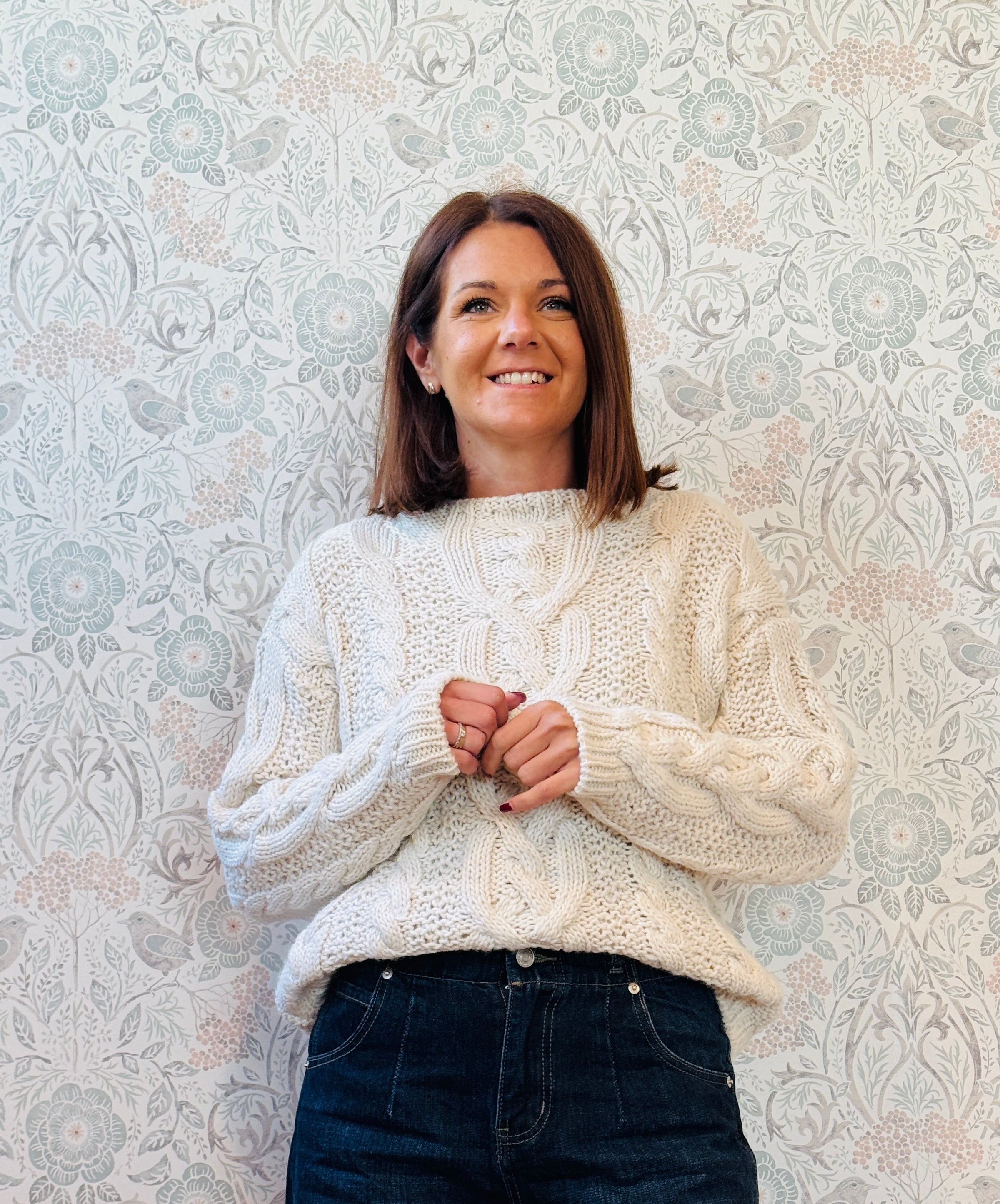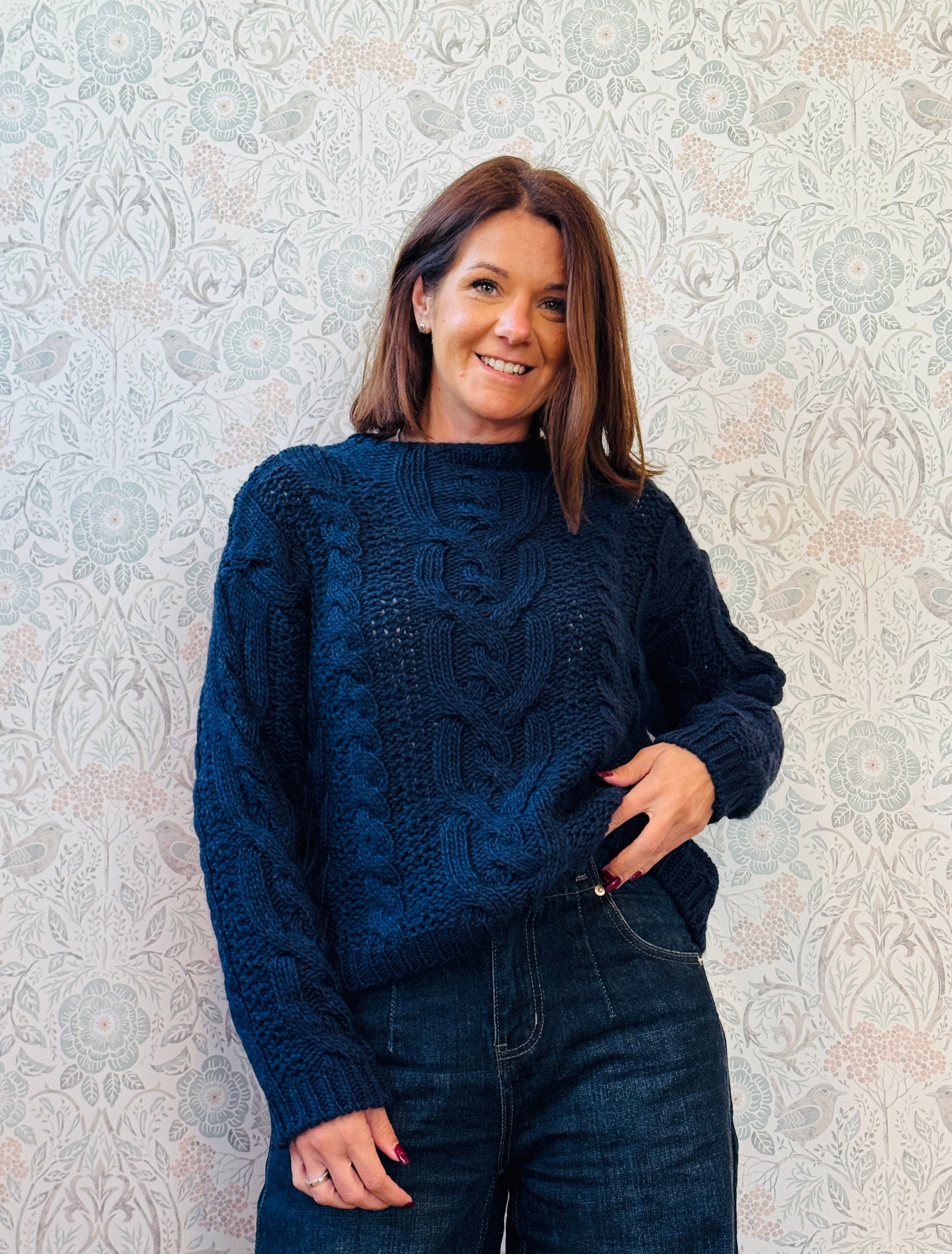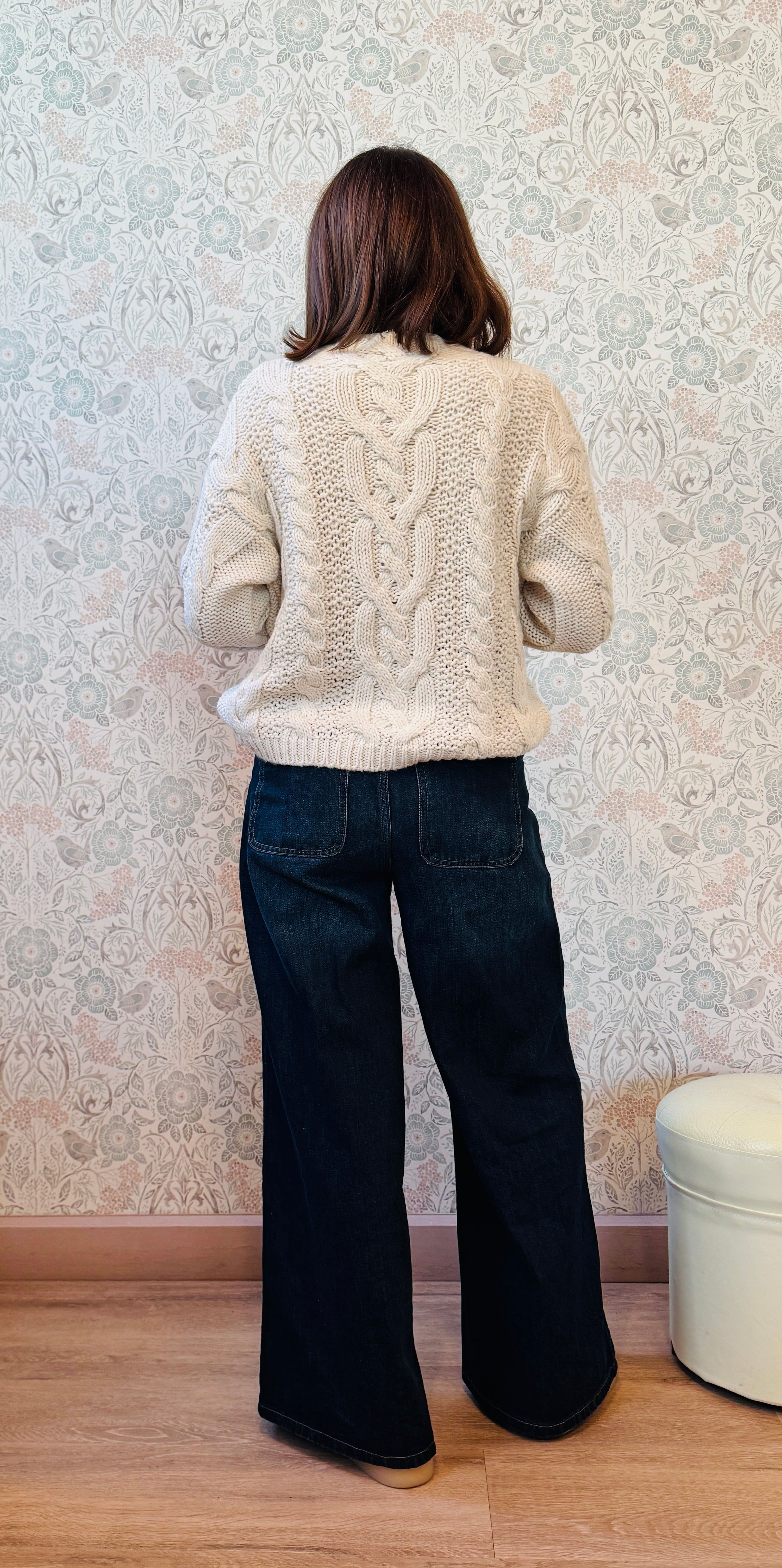Maglione a trama grossa con scollo tondo e lavorazione tricot con trecce. Vestibilità morbida e ampia.