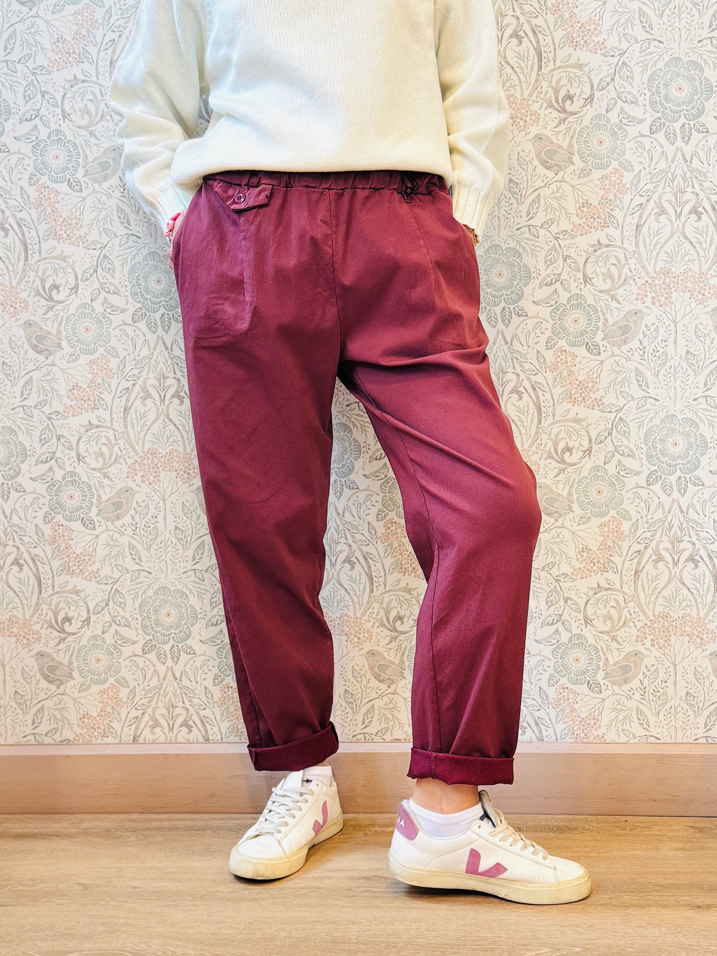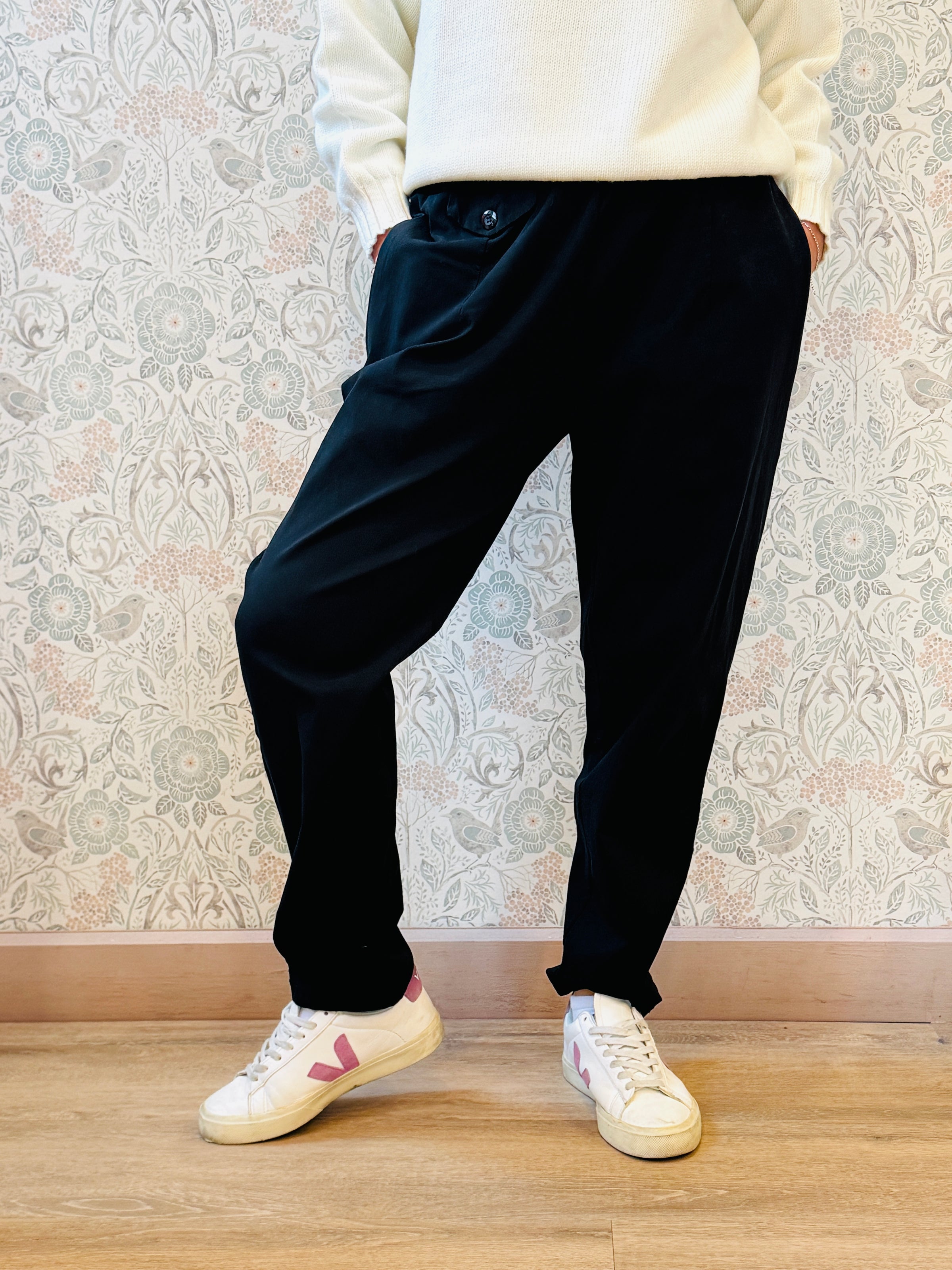 Pantalone modello baggy con elastico in vita, con tasche laterali aperte e tasca decorativa sul davanti.